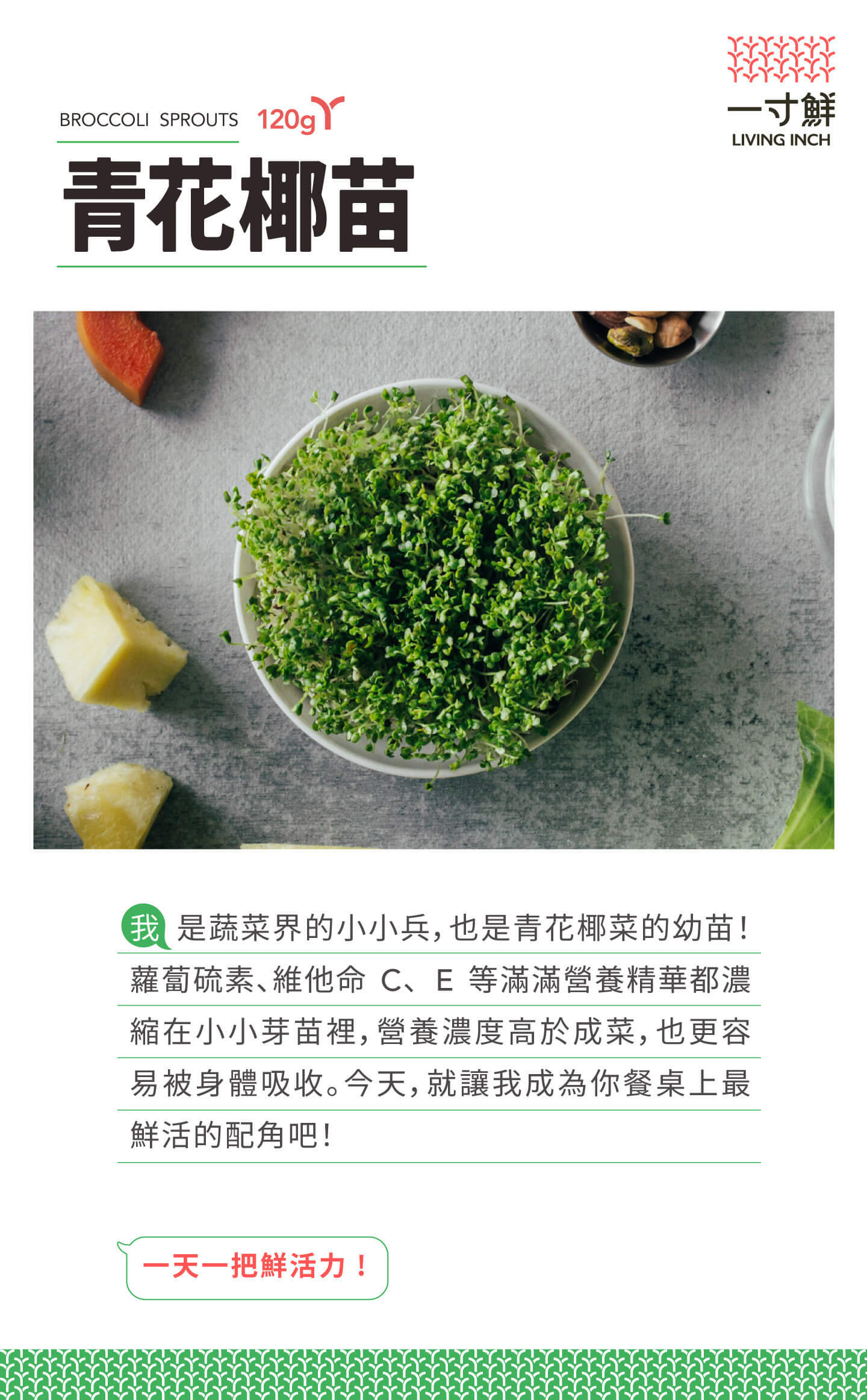 蘿蔔硫素、維他命 C、 E 等滿滿營養精華都濃縮在小小芽苗裡,營養濃度高於成菜,也更容易被身體吸收。