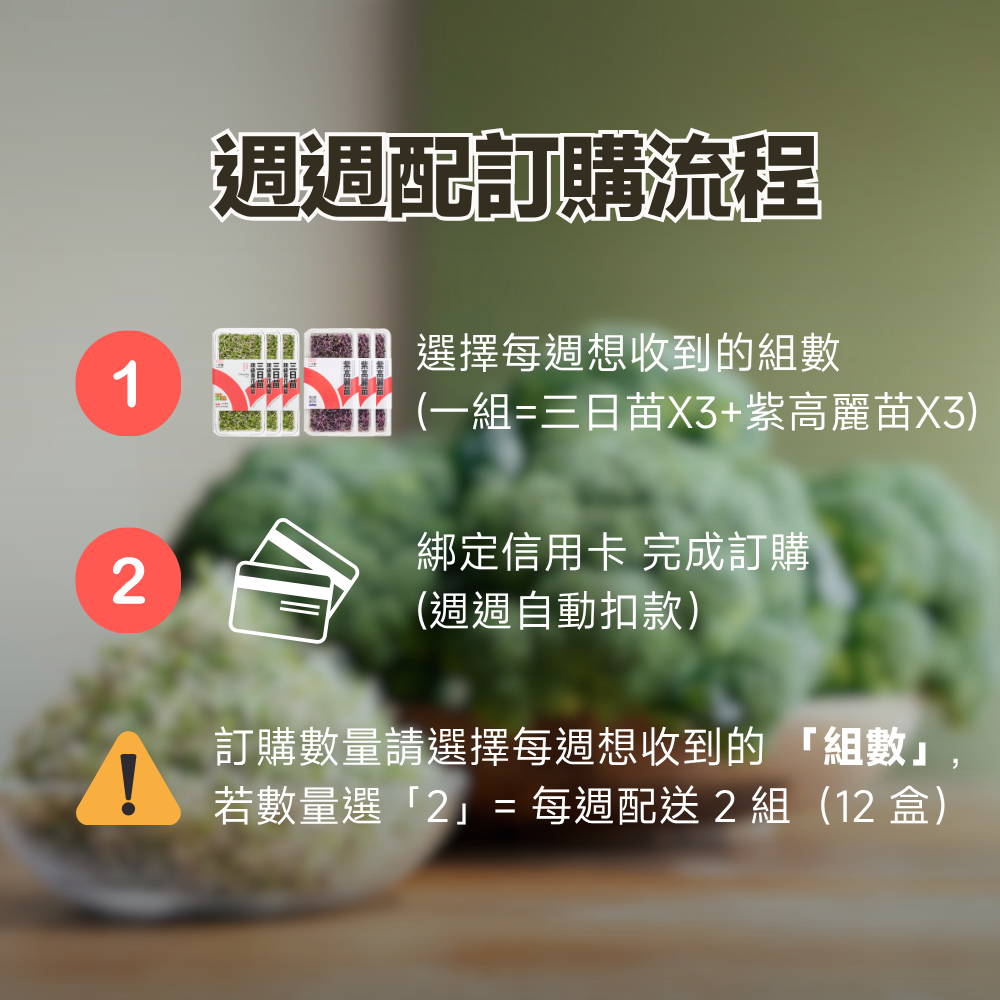 每次 3 盒三日苗 X 3 盒紫高麗苗,每週自動宅配到家。