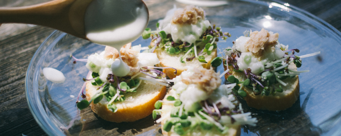 自製沙拉醬有優格與鮪魚的甜味,配上洋蔥與西洋芹的清香。再加上底層的蘿蔔嬰與紫高麗苗,天然的微辣帶出三種層次的美味。