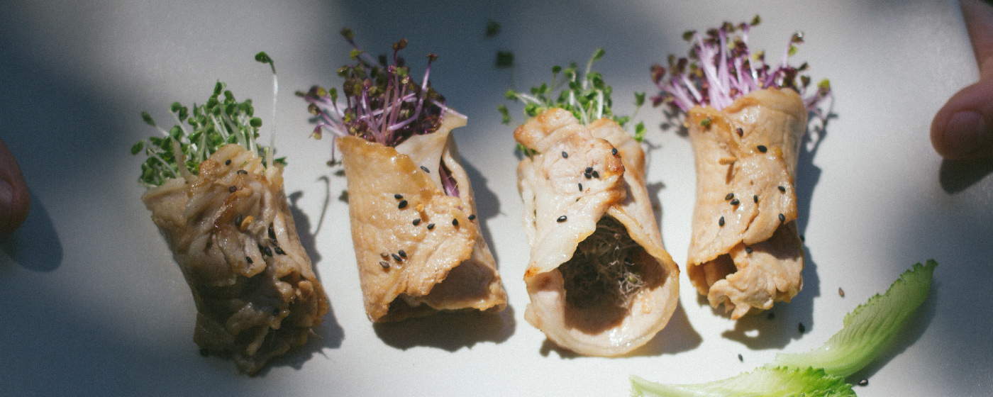 選用蘿蔔嬰與燒肉的厚實口感結合,不只中和了肉類蛋白質的油膩感,口中蘿蔔嬰特有的嗆辣韻味也將被巧妙地轉化成清脆爽口的風味。