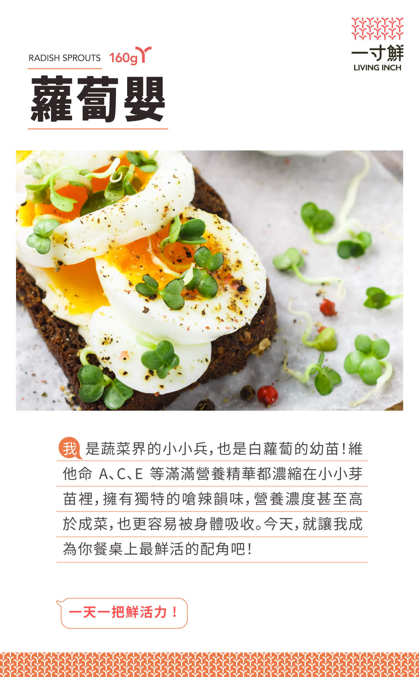 維他命 A、C、E 等滿滿營養精華都濃縮在小小芽苗裡,擁有獨特的嗆辣韻味,營養濃度甚至高於成菜,也更容易被身體吸收。